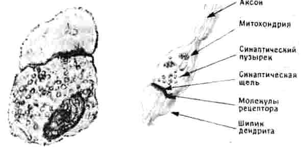 Рис. 3.4. Синапс. Слева — электронно-микроскопическая картина синапса после удаления окружающего фона. Справа — рисунок, сделанный художником. Приходящие по аксону нервные импульсы вызывают освобождение молекул нейромедиатора из мелких пузырьков пресинаптического окончания. Медиатор диффундирует через синаптическую щель к шипику на дендрите, где его ожидает молекула рецептора. При взаимодействии медиатора с рецептором возникает сигнал, активирующий или ингибирующий постсинап-тическую клетку. После этого медиатор разрушается ферментами. Энергию для биохимического процесса высвобождения медиатора доставляет окисление глюкозы в митохондриях. Синапс, подобный изображенному здесь, имеет около 0,2 мкм в диаметре.