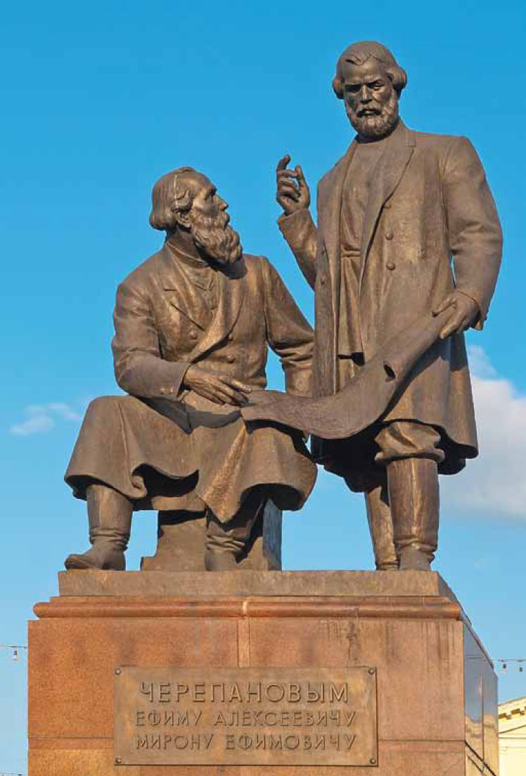 Памятник Черепановым установлен на центральной площади Нижнего Тагила.