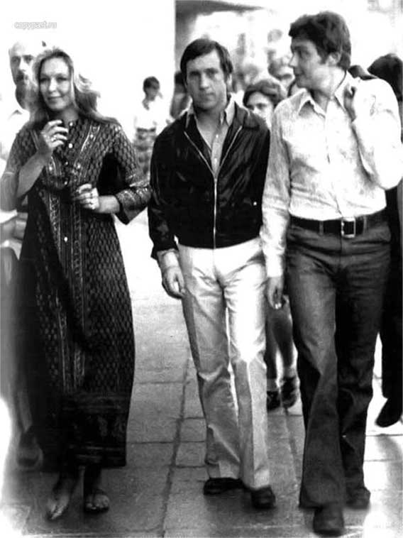 Слева направо: Марина Влади, Владимир Высоцкий и Всеволод Абдулов. 8-й московский кинофестиваль. Июль 1973 г.