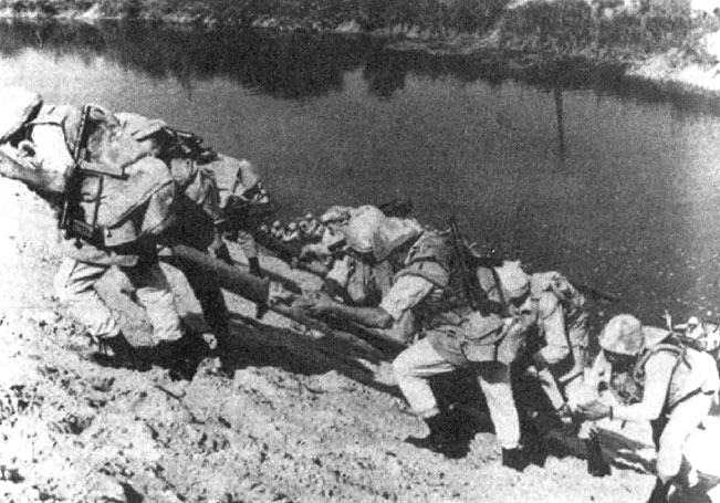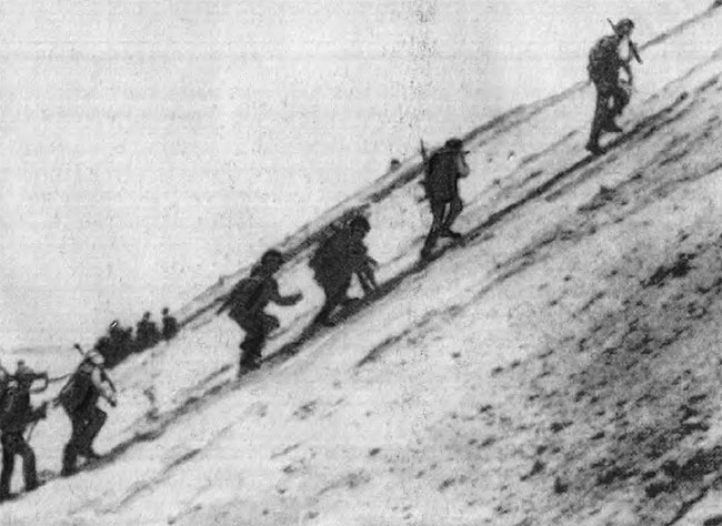 Египетские солдаты преодолевают двадцатиметровую песчаную насыпь, возведенную израильтянами перед укреплениями линии Барлева.