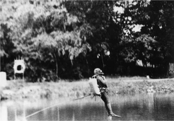 Подготовка водолаза-разведчика: десантирование в воду с контейнером — он крепится на 10-метровом фале и приводняется первым. Середина 70-х годов. (Фото автора)