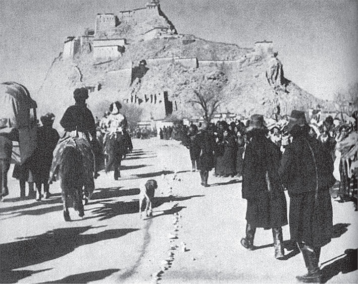 Торжественная процессия сопровождающих паланкин Далай-ламы во время его бегства от китайцев в 1951 году. На фоне крепости Гьянце