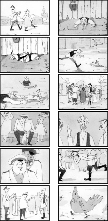 То, что сохранилось от раскадровки рассказа А. Чехова “Хамелеон”.