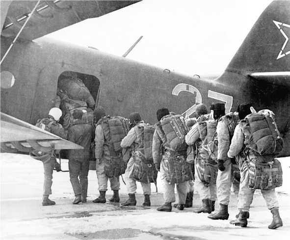 Зимние тренировочные прыжки с парашютом (посадка в самолет). Кроме парашютов на водолазах-разведчиках закреплены десантные контейнеры. (фото автора)