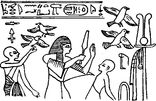 Четверку почтовых голубей выпускают во время ежегодного религиозного праздника, чтобы они оповестили богов четырех частей света о возобновлении власти фараона.