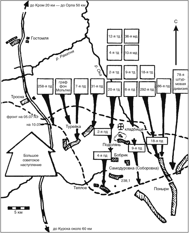 «Операция Цитадель» с показом детального расположения немецких войск, участвовавших в наступлении в южном направлении на северном участке Курского выступа 5 июля 1943 года. Русские позволили немцам продвинуться вперед не более чем на 12 км. Наступление на южном участке Курского выступа в северном направлении было более успешным, но прекращено 14 июля, вероятно из-за вторжения союзников на Сицилию[93]. 22 июля 1943 года советские войска начали массированное контрнаступление.