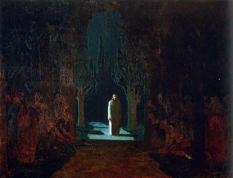 Русская философия 1870–1880 охватила разные стороны человеческого творчества — науку, искусство, литературу. Остаться не вовлеченным в этот поток сознания было невозможно, как и не разделить идеи своего времени. Нет сомнения, что повышенное внимание Куинджи к вопросам мироздания, его размышления о месте в нем человека — это своего рода реакция искусства на мировоззренческую проблематику. Космология тесно соприкасалась с религией. Пытаясь проникнуть в тайны мироздания, художник словно робеет перед открывающимися безднами. В картине «Христос в Гефсиманском саду» (1901, Алупкинский дворец-музей) перед нами завершение формирования философского пейзажа Куинджи. Разгадать смысл его произведений очень сложно, ибо художник не оставляет намеков и подсказок на тайное содержание своих полотен. В картине нет драматизма. Перед нами Христос в белых одеяниях, горящих фосфоресцирующим светом. На фоне темных деревьев Его фигура выглядит очень контрастно и создает удивительное впечатление. Таких декоративных эффектов в русском искусстве начала XX века никто не достигал.