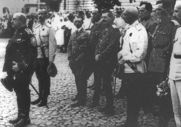 Командующий Добровольческой армией генерал-лейтенант B. З. Май-Маевский (первый слева), командующий Полтавским отрядом генерал-лейтенант Н. Э. Бредов (второй слева) и командир 5-го кавалерийского корпуса генерал-лейтенант Я. Д. Юзефович (шестой слева) на параде. Киев, сентябрь 1919 г.