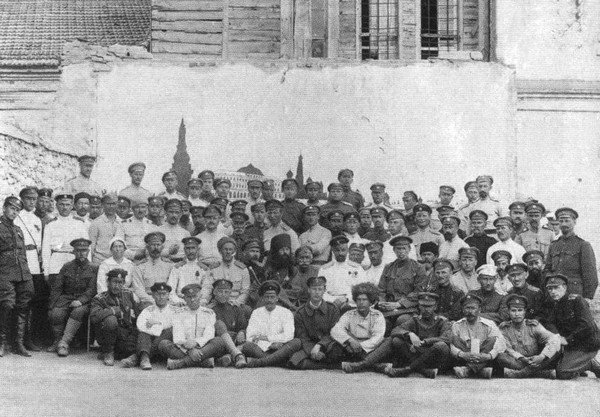 Быховские узники. Цифрой 1 обозначен Л. Г. Корнилов, цифрой 2 — А. И. Деникин, цифрой 9 — С. Л. Марков. Быхов, сентябрь 1917 г.