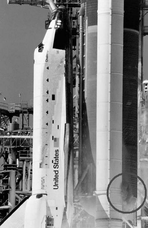 Во-первых, нам показали детальные снимки дыма, который повалил из шаттла, когда он еще стоял на стартовом столе. Там повсюду были камеры для наблюдения за запуском шаттла – штук сто, наверное. Прямо на то место, откуда появился дым, были направлены две камеры – но обе почему-то не сработали. Тем не менее на фотографиях с других камер виднелись четыре или пять клубов черного дыма, идущего от монтажного соединения. Этот дым был не от горения материала; по составу это были просто уголь и всякая гадость, которая выталкивались из-за давления внутри ракеты.