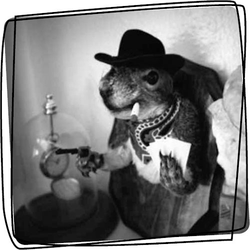 Это очень странно. Мало того что я не ждала посылок с расчлененными белками, так белка еще и наряжена ковбоем. В лапе она держит крошечный пистолетик, угрожающе наставленный на того, кто на нее смотрит (наверное, чтобы защитить миниатюрные меченые карты, которые она держит во второй лапе), и она всегда смотрит прямо в глаза, где бы ты ни стоял, прямо как Мона Лиза.