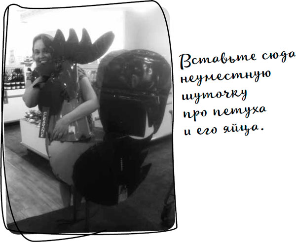 – У нас потери! Срочно убрать в третьем ряду, – но продавец не засмеялся. Потом пришел управляющий, чтобы посмотреть, из-за чего вся эта суматоха, и застал нашего чересчур старомодного продавца за тщетными попытками поставить на ноги несговорчивого петуха почти с себя ростом. Продавцу это давалось с большим трудом, и он попросил всех отойти, «иначе петух порежет». Сначала мне подумалось, что он хочет предупредить об угрозе со стороны петуха, типа «у этого петуха заточка», но, как оказалось, он имел в виду, что у него острые и ржавые края. Петух был просто охренительный, и мы с Лаурой сошлись во мнении, что, даже если мы и подцепим столбняк, он все равно уже себя окупил.