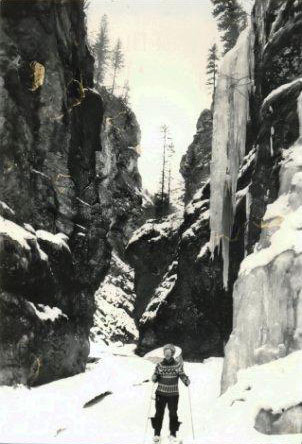Скалы начинают снижаться, но поворот следует за поворотом, и хотя пора возвращаться, каждый раз все хочется за него заглянуть. Воздух стал теплее, снег рыхлый, просвет среди скал впереди ниже, в каньон попадает больше солнца. Пора поворачивать назад. Пройдя метров 30 назад, оглядываюсь и не вижу Николая Петровича. Куда он мог деться среди отвесных скал? Приглядевшись, замечаю едва заметную над снежной горкой шапку своего товарища. Спешу назад. Оказывается, он провалился в наметенный среди двух огромных каменных глыб снег и не может оттуда выбраться. Хорошо еще, что внизу оказался лед, а не вода. Слава богу, целы руки и ноги, вот только фотоаппараты «по уши» забиты снегом.