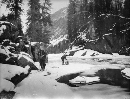 Ниже «Щек» много чистой, спокойно текущей на плесе воды. Как же идти через «Щеки»? Ведь в них быстрое течение и очень глубокие ямы. В середине реки лед. Но крепок ли? У скал слева и справа видно, что ледок совсем слабенький, местами черные промоины. Облазить скалы по верху? Но сделать это будет не легко, да и выдохлись мы уже изрядно, чтобы как козы прыгать по скалам. Нужно экономить силы. Решаем пройти по реке. Осторожно переходим по льду ниже «Щек» к левому берегу. Теперь самое трудное — пройти возле отвесной скалы вверх через «Щеки». Лев Степанович решает, что этот тонюсенький лед с промоинами не для его веса и начал перелаз верхом через скалу. Мы с Николаем Петровичем осторожно продвигаемся вдоль скалы по реке. Лед не сплошной, наплывами, кое-где потрескивает под лыжами. На всякий случай, если провалимся под лед, идем в некотором отдалении друг от друга. Лыжи не закреплены, все веревочки развязаны, чтобы можно было сразу высвободить ноги, рюкзак висит только на одном плече. Благополучно проходим скалу — вздох облегчения. А Лев Степанович еще застрял на верху скалы. Вид оттуда, по-видимому, великолепный, поэтому он беспрерывно щелкает фотоаппаратом и не спешит слезать.
