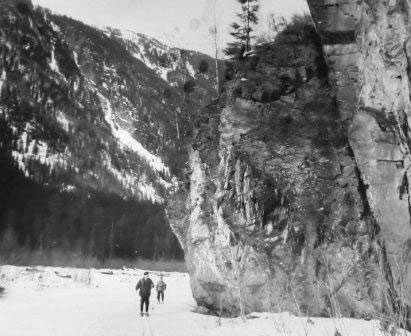 Приближаемся к «Щекам». Наледь выше их замерзла, но в середине, где был осевший лед, промыло фарватер чистой воды. В 12 часов 20 минут достигаем «Щек». Лед между ними проело — пройти невозможно. Придется перелазить по скалам. Сняв лыжи, карабкаемся по камням и вскоре мы уже за «Щеками». Отойдя от них на несколько десятков метров, переходим на правый берег Абакана и устраиваем привал у «пироги» Лыковых — старой лодки, сейчас заваленной снегом.