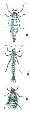 Личинки стрекоз: а — коромысла; б — красавки; в — нимфа эпитеки