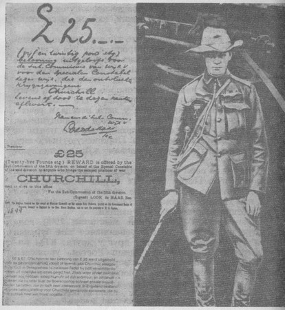 Слева: бурское объявление о розыске Уинстона Черчилля, бежавшего из плена. Справа: молодой Уинстон Черчилль в Трансваале