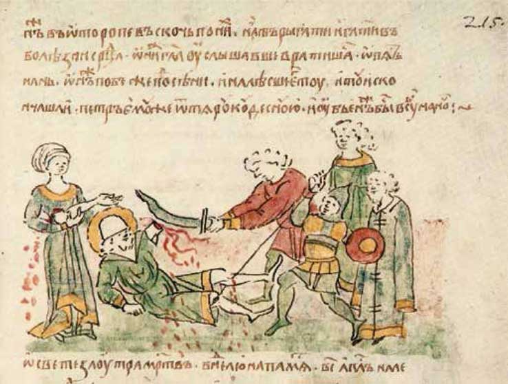 Убийцы добивают князя Андрея Боголюбского. Миниатюра Радзивиловской летописи