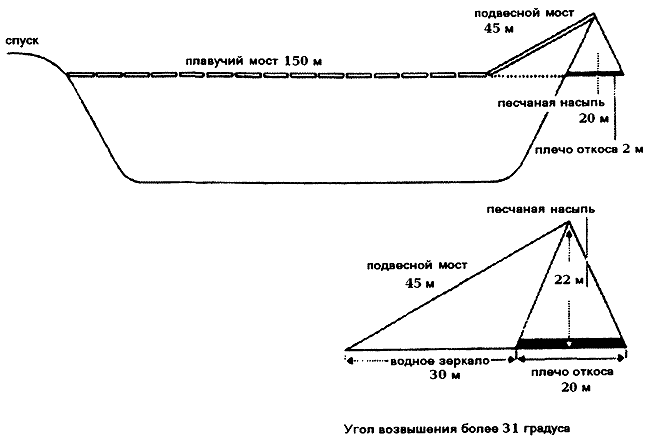 • Эти плечи необходимо было разрушить перед тем, как канал мог форсировать легкий плавающий танк или иное транспортное средство или до введения в строй какого-либо плавающего моста.