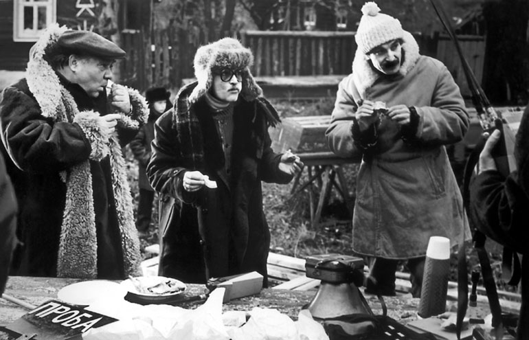 “Слезы капали”. Е. Леонов, Г. Данелия, Ю. Клименко на съемках в Ростове-Ярославском. 1981 год.