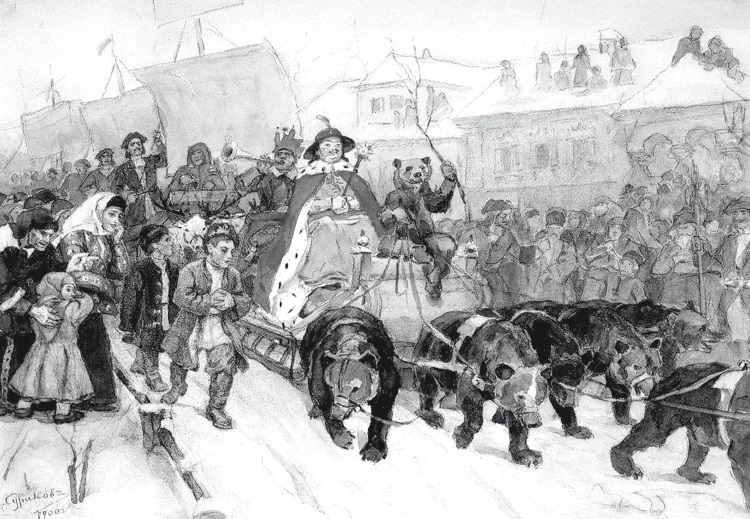 Большой маскарад в 1722 году на улицах Москвы с участием Петра I и князя-кесаря И. Ф. Ромодановского. Выполнено по описанию камер-юнкера Берхгольца.