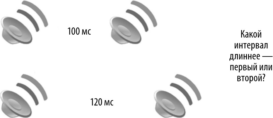 Изучением способности различать интервалы времени начали заниматься еще в конце XIX в., однако окончательный ответ на вопрос о роли практики был получен только в 1990-х гг. Одно из первых систематических исследований на эту тему было проведено в Калифорнийском университете в Сан-Франциско Беверли Райтом, мной и нашими коллегами Генри Манком и Майклом Мерзеничем. Мы проводили стандартный эксперимент по дискриминации112 временны?х интервалов, в котором просили участников сравнить пару интервалов и ответить, который из них — первый или второй — был длиннее. В этом задании каждый интервал прерывался двумя короткими звуками (по 15 мс каждый). Например, в первом случае это могли быть два звука, разделенные стандартным интервалом длительностью 100 мс, а во втором случае два звука разделялись так называемым интервалом сравнения длительностью 120 мс (рис. 5.1). Различие в длительности стандартного интервала и интервала сравнения (в данном случае 20 мс) обозначается символом ?t (дельта-t). Если участник эксперимента все время правильно идентифицировал длинные и короткие интервалы длительностью 100 и 120 мс, следовательно, его внутренний таймер имеет разрешение менее 20 мс.