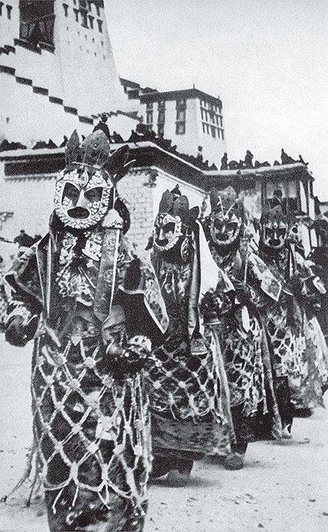 Монахи, танцующие во время празднования «малого Нового года» в столичном районе Шо у подножия Поталы. На них раскрашенные деревянные маски и сетчатые «фартуки», сделанные из человеческих костей и слоновой кости. В руках – ритуальные жезлы-ваджры и колокольчики