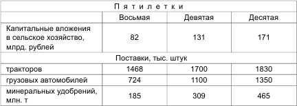За истекший период капитальные вложения в сельское хозяйство составили 380 млрд. руб., что позволило укрепить его материально-техническую базу, увеличить в 2,6 раза энергетические мощности. Применение минеральных удобрений в 1980 году достигло 86 млн. тонн против 26,9 млн. тонн в 1965 году.