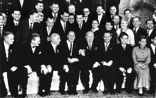 Участники 1-го Всесоюзного съезда журналистов. Среди присутствующих: 1-й ряд слева направо – генеральный директор ТАСС при СМ СССР Н.Г. Пальгунов (2-й слева), председатель президиума ВС СССР К.Е. Ворошилов, главный редактор газеты «Правда» П.А. Сатюков, председатель СМ СССР Н.С. Хрущев, член Политбюро ЦК КПСС М.А. Суслов (6-й слева), член президиума ЦК КПСС Е.А. Фурцева, член Президиума ЦК КПСС Н.А. Мухитдинов. 1959 год