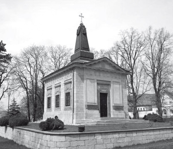 А в прозаических примечаниях к поэме, также сделанных Жуковским, мы читаем: «На самом берегу Славянки, под тенью дерев, воздвигнут прекрасный памятник великой княгине Александре Павловне. Художник умел в одно время изобразить и прелестный характер, и безвременный конец ее; вы видите молодую женщину, существо более небесное, нежели земное; она готова покинуть мир сей; она еще не улетела, но душа ее смиренно покорилась призывающему ее гласу; и взоры и рука ее, подъятые к небесам, как будто говорят: да будет воля твоя. Жизнь, в виде юного Гения, простирается у ее ног и хочет удержать летящую; но она ее не замечает; она повинуется одному Небу – и уже над головой ее сияет звезда новой жизни».
