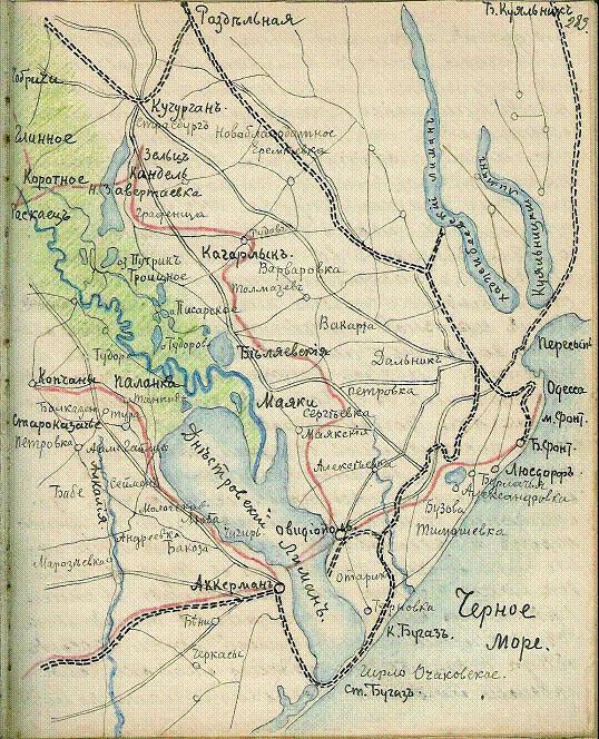 С этого дня начались наши мытарства по этапам. Это было не меньшее испытание, чем весь пройденный путь. Мы привели выше скопированную нами в штабе карту той местности, по которой отступали добровольцы из Одессы на Румынию, и наметили красной линией путь нашего следования от Одессы до Аккермана.