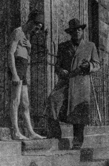 «Главное сознавать, что твое искусство сегодня нужно стране и народу, — говорит Аркадий Райкин. — И это нужно чувствовать и решать для себя самому. — И снова он вспоминает Чаплина. — Этот замечательный художник всегда старается быть на уровне своего века. Прекрасное и беспокойное искусство. Бродяга Чарли восстает против войны. В эпоху так называемого просперити он создает фильмы, показывающие истинную цель процветания. Фантастические приключения героя „Золотой лихорадки“. Образ нового времени в эпизоде открытия памятника „Мира и процветания“ в фильме „Огни большого города“. Помните, бродяга, повисший на мече статуи… С высоты памятника он посылает приветы горожанам, то подрыгивая ногами, то вежливо приподнимая котелок. Сатирический образ необыкновенной силы! А смотрите дальше. Вторая мировая война. Чаплин пользуется своим замечательным оружием и создает антифашистскую картину „Диктатор“. А сейчас он думает о новых сюжетах, его волнует идея полета на Луну. Да, герой Чаплина, маленький человек, живет большой мечтой своего времени».