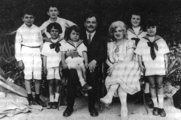 Александр Ажид с женой и детьми в саду «Эрмитаж». В первом ряду (слева направо): Андре, Жорж, Роже на коленях отца, Эстер и Сюзанна; во втором ряду — Рене и Лилиан.