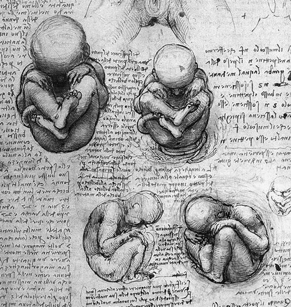 Говоря о работе да Винчи как исследователя-анатома придется вновь и вновь повторять слова «первый» и «впервые». Он начинает свое исследование с самых основ: с зачатия. И да, Леонардо первым делает рисунок человеческого эмбриона, находящегося внутри анатомированной матки, и первым высказывает предположение, что рассматривать зародыш можно и нужно не только в один определенный момент, а последовательно, на протяжении определенного времени наблюдая его изменения. Заметим, что развитие современной эмбриологии началось лишь… в 1759 году трудами немецкого анатома и физиолога Каспара Фридриха Вольфа.