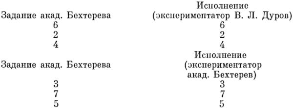 Обстановка опытов: задуманные цифры писались на бумаге, причем при опытах, лично произведенных академиком Бехтеревым, цифры, написанные им, никому заранее не были известны до окончания опытов».