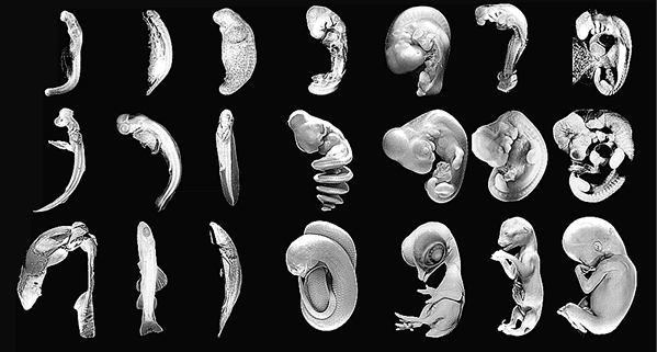 От верхнего к нижнему ряду: ранние, промежуточные, поздние стадии эмбрионального развития