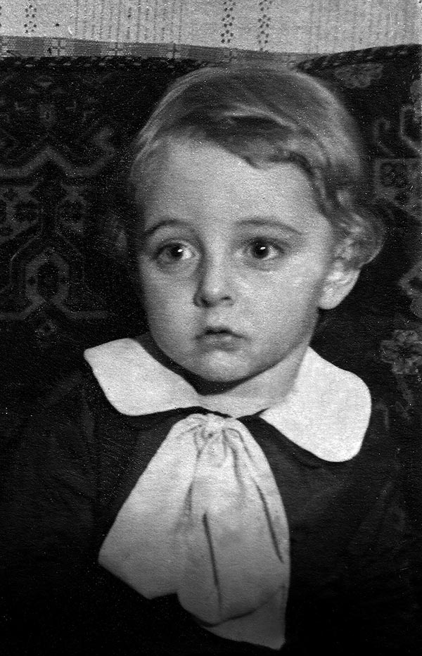 «Каким-то чудом уцелели несколько моих довоенных фотографий. С одной из них удивленно смотрит малыш примерно трех лет, в темной блузе с большим светлым бантом, большелобый, с белокурыми локонами и огромными, широко раскрытыми светлыми глазами».
