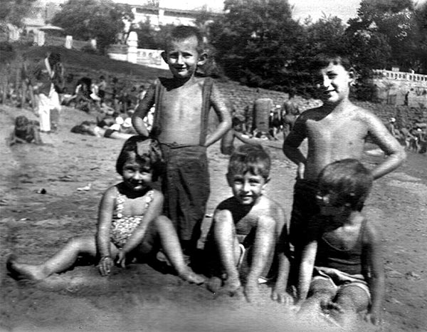 На пляже в Аркадии. Девочка с бантом – моя кузина Оксана. Справа стоит мальчик Витя, которого я встретил в тюрьме осенью 1941 года и которого сожгли в сараях под Одессой. 1938 г.