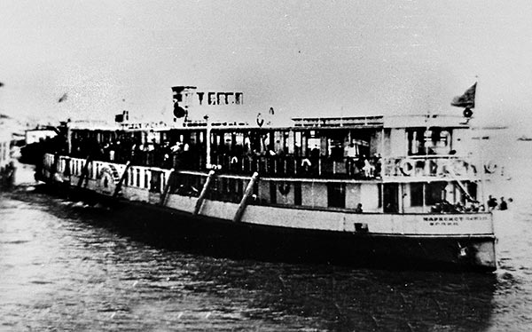 1945 г. «В августе Театр Образцова на зафрахтованном речном пароходе отправлялся в двухмесячную гастрольную поездку по Волге от Москвы до Астрахани и обратно». Пароход «Марксист» на Волге.