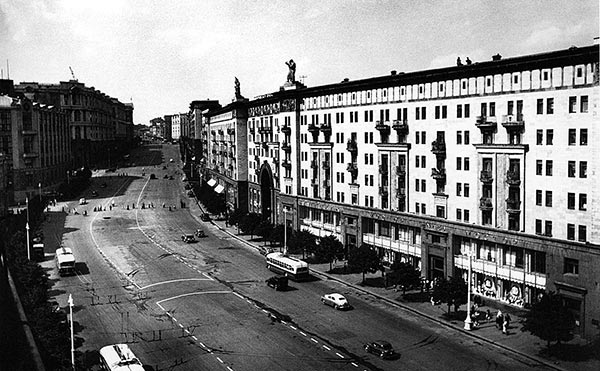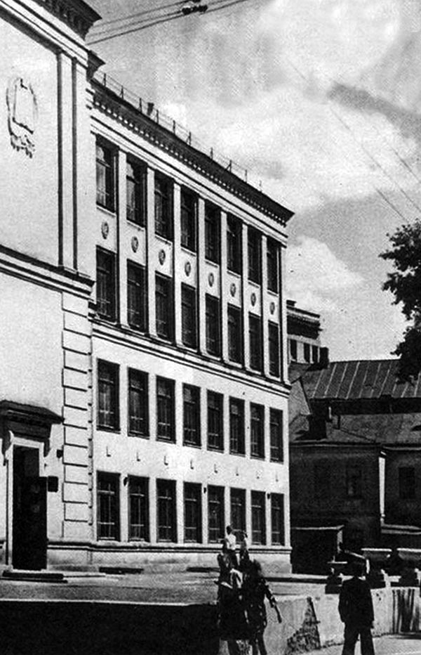 «Наш Станкоинструментальный институт носил имя Сталина, и его грандиозная фигура в развевающейся шинели нависала над всеми входящими в просторный высокий вестибюль». Здание Станкина. Фото 1950-х гг.