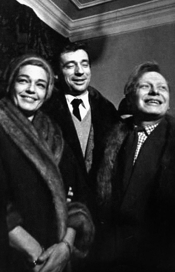 «В 1953 году, будучи в Париже, Образцов познакомился с уже известным шансонье Ивом Монтаном, пленился его концертами… В конце 1956 года, несмотря на венгерские события, Монтан с женой, замечательной актрисой Симоной Синьоре, приехал в Москву». Рядом Сергей Образцов.