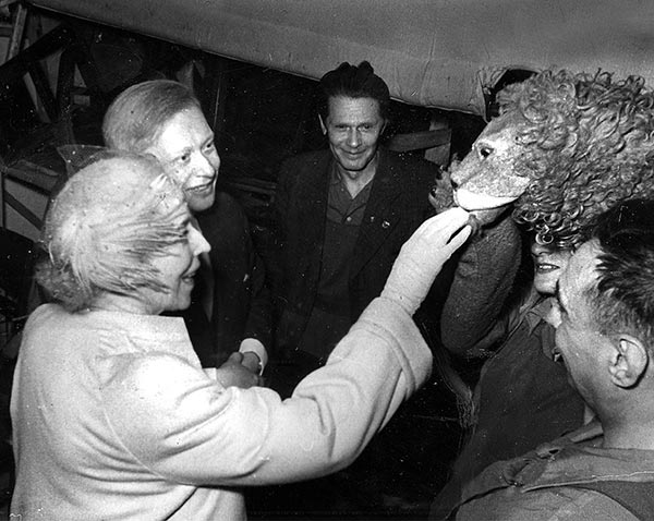 Павел Мелиссарато с куклой льва из «Волшебной лампы Аладдина», целующего руку королеве бельгийцев Елизавете, Праведнику народов мира. 1962 г.