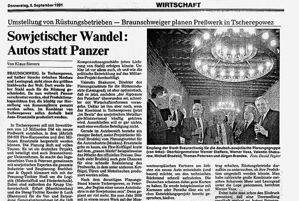 Статья о нашем проекте «Автомобили вместо танков» с фотографией приема нашей делегации в ратуше Брауншвейга в сентябре 1991 г.