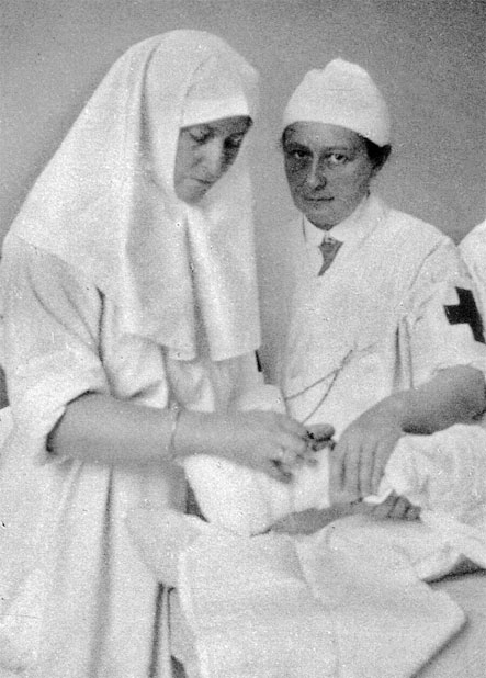 Княжна Вера Гедройц (справа) и императрица Александра Федоровна в перевязочной Царскосельского госпиталя. 1915 г.