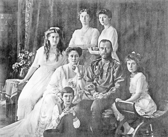 Царская семья в 1913 г. Сидят (слева направо): Мария, императрица Александра, император Николай II, Анастасия, цесаревич Алексей (спереди). Стоят (слева направо): Ольга и Татьяна