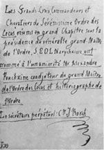 «Великие кавалеры, командоры и рыцари светлейшего Ордена Рогоносцев в полном собрании своем, под председательством великого магистра Ордена, его превосходительства Д.Л. Нарышкина, единогласно выбрали Александра Пушкина коадьютором (заместителем) великого магистра Ордена Рогоносцев и историографом ордена.