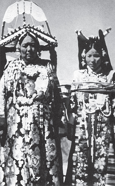 Супруга и невестка одного из членов Кабинета министров в традиционных костюмах своих родных провинций Цан и У (Лхаса)