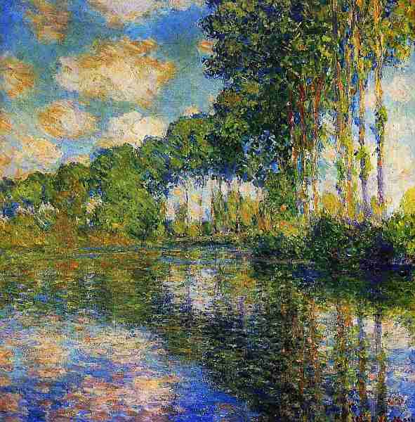 Композиция картины «Тополя на Эпте» (1891, Национальная галерея Шотландии, Эдинбург) выстроена по принципу зеркальной симметрии и представляет зрителю две реальности: тополиную рощу на берегу реки Эпт и ее отражение в речной воде. Река принимает все краски, которыми окрашено небо, розоватые облака, зеленые и буро-желтые оттенки листвы. Характер мазков определяет трепетность воды.