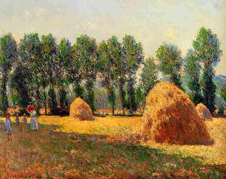 Еще в 1886 художник написал незатейливый сельский пейзаж «Стог сена в Живерни» (Государственный Эрмитаж, Санкт-Петербург), на переднем плане которого красуется сено, а вдали виднеются домики, деревья и поля. К этому мотиву художник вернется в 1888 в серии из 25 работ, в которых окружающий пейзаж станет условным, практически исчезнет деление на композиционные планы, стог сена обретет самостоятельную роль, словно сосредоточив в себе некий концептуальный центр бытия, а главным действующим лицом, переходящим из одной работы серии в другую, станет цвет, стремящийся передать изменчивый свет. В день Моне работал над несколькими холстами, передающими утреннее, дневное и вечернее освещение — в этом была оригинальность метода художника, который также лежал в основе создания серии «Тополя».