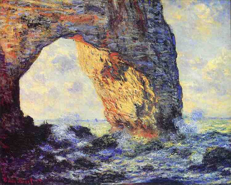 Моне часто писал скалы около городка Этрета, являющиеся основной достопримечательностью этой местности, благодаря своей необычной форме, созданной по прихоти волн. Маннпорт — самая известная скала-арка. Для сопоставления масштабов человеческой фигуры и каменной скалы художник намечает буквально несколькими мазками две фигурки под сводами огромной арки, громада которой, властно выступающая из-за левого края картины, готова их раздавить. Этому впечатлению способствует композиция работы: по замыслу художника вся скала не вошла в рамки картины, что создает эффект бесконечности каменной поверхности.